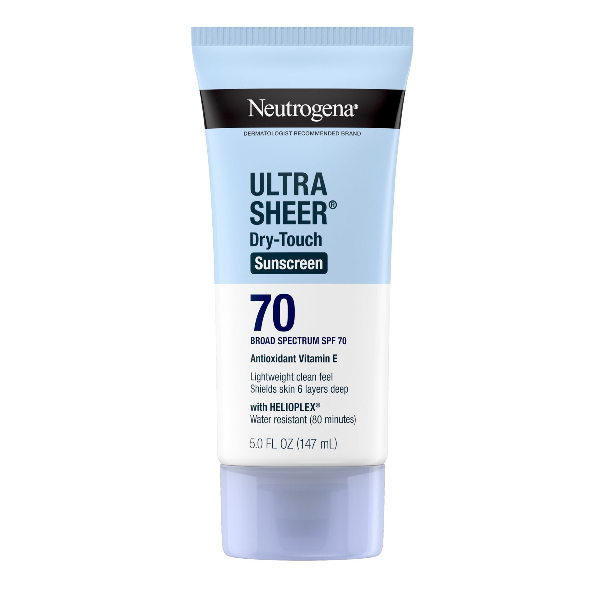 - El protector solar Neutrogena Ultra Sheer, Dry-Touch, con SPF 70, protector solar de amplio espectro brinda una poderosa protección solar que le encantará usar sin el acabado pesado. Con avobenzona, homosalato, octisalato y octocrileno como ingredientes activos, este protector solar corporal no graso no contiene oxibenzona y cumple con la Ley 104 de Hawaii. Con tecnología Helioplex para brindar una protección superior UVA/UVB contra el envejecimiento de los rayos UVA y la quema de rayos UVB. Enriquecida con vitamina E antioxidante, la loción ligera para protector solar SPF con tecnología Dry-Touch se absorbe rápidamente para una sensación limpia y ultraligera y un acabado no brillante. La fórmula de loción de protector solar no es comedogénica y no contiene PABA. Este protector solar Neutrogena es resistente al agua hasta por 80 minutos y proviene de una marca de cuidado solar recomendada por dermatólogos. Aplicar antes de la exposición al sol para mantener la piel protegida durante actividades al aire libre como jardinería, ciclismo, senderismo, paseos en bote o caminatas. Protéjase mientras recibe su dosis diaria de sol.