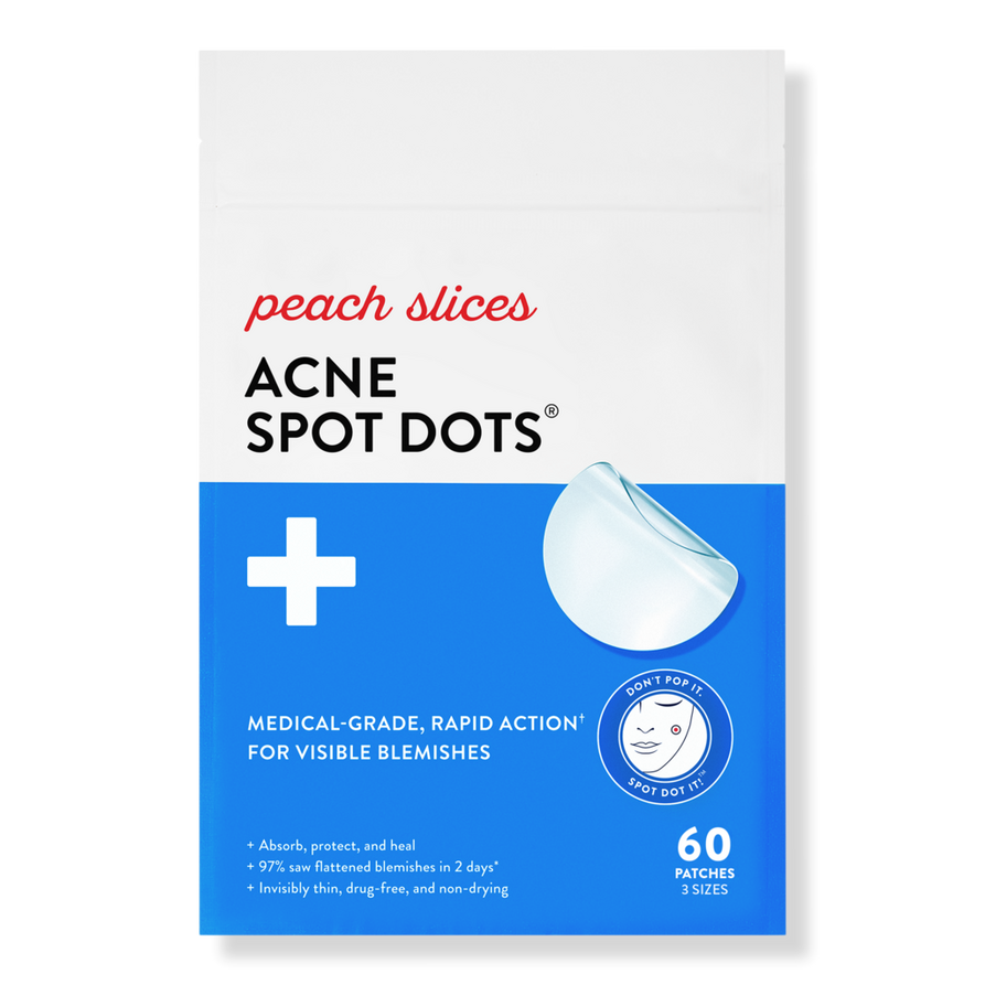Peach Slices #1 Bestseller Acne Spot Dots absorbe secreciones, reduce la inflamación y acelera la curación, para manchas visiblemente más pequeñas en menos de un día.